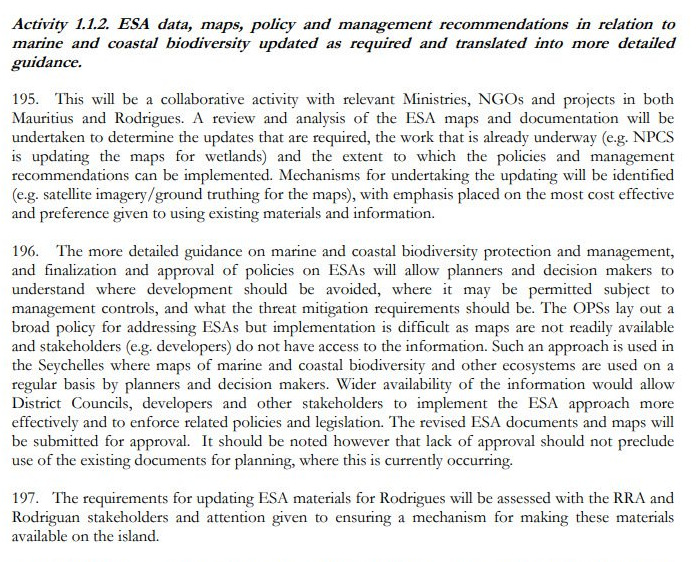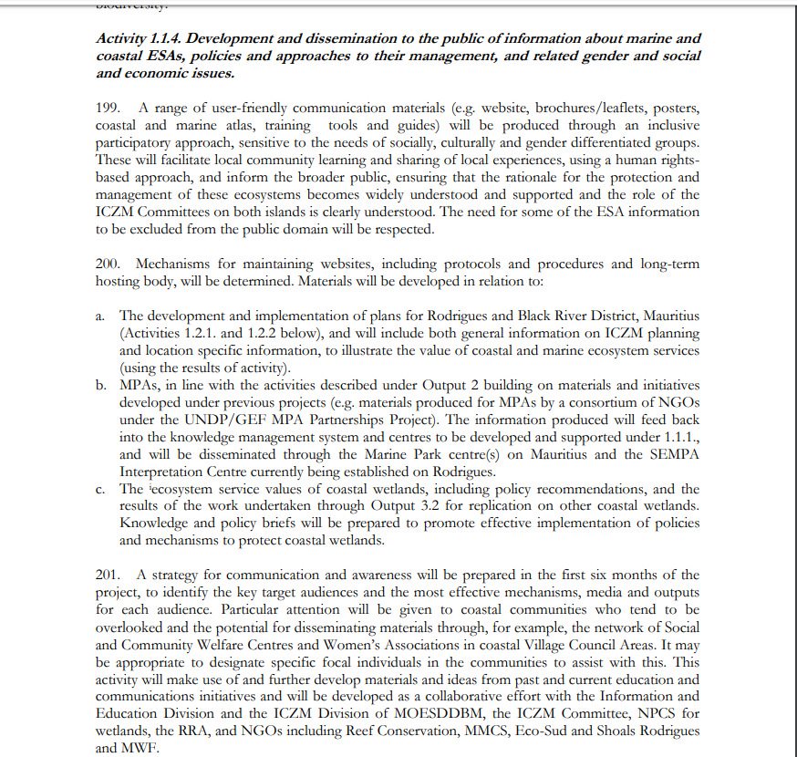 “The project aims to conserve and sustainably manage coastal and marine biodiversity in the RM, using the proxy of Environmentally Sensitive Areas (ESAs) which are defined as areas that are rich in biodiversity and that provide essential ecosystem services, but that suffer from growing anthropogenic pressures. The project addresses six coastal and marine ESA types (seagrass and algal beds, coral reefs, sand beaches and dunes, intertidal mud flats, coastal wetlands, and mangroves) covering just under 41,000 ha, of which about 60% lies in Rodrigues and 40% in Mauritius. The management of these ESAs will be mainstreamed into the operations and policies of the tourism and physical development sectors, and protection of key ESAs will be assured through the improved management of existing marine protected areas (MPAs) and the creation of new MPAs where required. The project will also demonstrate techniques for soil erosion prevention and coastal wetlands restoration that will lead to sustainable management of, and maintenance of ecosystem services provided by, these ESAs.”
