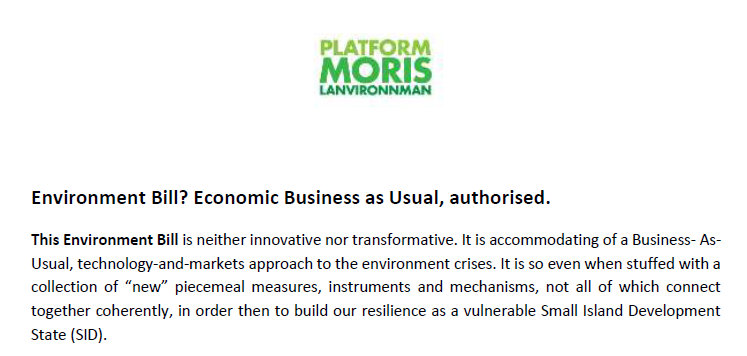 “This Environment Bill is neither innovative nor transformative. It is accommodating of a Business- As-Usual, technology-and-markets approach to the environment crises. It is so even when stuffed with a collection of “new” piecemeal measures, instruments and mechanisms, not all of which connect together coherently, in order then to build our resilience as a vulnerable Small Island Development State (SID).
